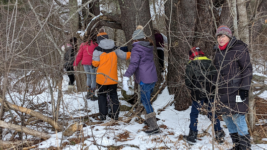 February ecology investigations led by the Belfast Bay Watershed Coalition Stewards, engaged THMS middle schoolers in the Merlin Club on a search for animal tracks. Using track guides, students identified signs and tracks of grey squirrel, snowshoe hare, and porcupine in the woods shared between the school and the YMCA. Belfast High School freshman Lavinia Welch provided guidance to students as they created terrariums featuring local mosses. A natural teacher, she modeled how to look closely at mosses with a hand lens so they could see how different the various species look. As an intern-teacher in the Merlin Club and as part of the BAHS Extended Learning Opportunities Program, Lavinia will earn credit and a stipend in addition to learning more about nature-based education.